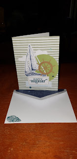 My MPP was here waiting for me and I finally ot a chance to sit down and do my samples. Changed up the sailboat card some as I wanted more of the sailboat visible, so with some minor adjustments I got the look I wanted. Also, stamped on 2 of the envelopes. Love the lining of inside of the envelopes.